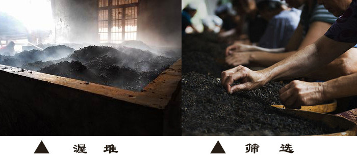 茯茶的压制方法分毛茶拼配筛制、汽蒸沤淮、压制定型、发花干燥和成品包装等作业。按照毛茶配方比例领料,采取“切碎多抖,循环切料,分身取料,四孔成茶”的筛制方法,经风选隔砂后即成茶坯。汽蒸是将茶坯过磅,送入蒸汽机加热,汽蒸时间为50秒钟。汽蒸后沤堆,堆高2-3m,时间3-4小时,当叶温达75-88℃,应即时翻堆散热,促使整个茶堆冷热干湿均匀。茶坯沤堆后,经水分检验,即可进行称茶、加茶汁、搅拌、蒸茶,然后装匣紧压,冷却定型。当砖温由80℃左右下降到50℃左右时约历时80分钟,便可用退砖机把茶砖退出,按照品质规格检查验收。合格者进入烘房,侧立排列在烘架上。进烘后有12-15天内为发花期阶段,以后的5-7天为干燥期阶段。发花阶段的室温应保持在28℃左右,相对湿度保持在80%左右,以利灰绿曲霉的繁殖生长;干燥期的温度则应逐渐升高,一般自30℃上升至45℃为止。出烘后应立即包装。