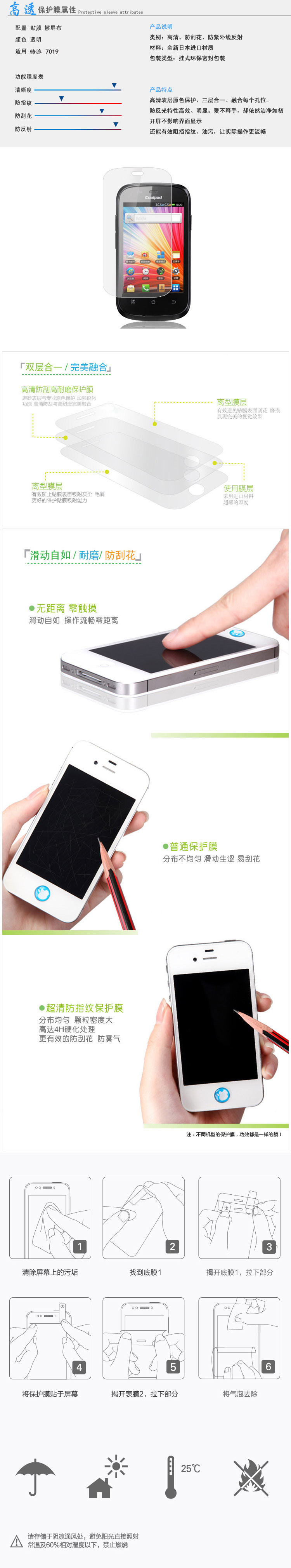 产品名称 : 酷派 7019高透耐刮花系列保护贴膜产品材料 :高度透光材质包装明细:保护膜1片,专用清洁无尘布1片 特 色 : 高度透光材质制造 屏幕显示进一步锐化 高透清晰 画面效果尤佳 专业原色保护 液晶面视觉效果清透舒适 色层丰富 产品更防刮 耐磨损 使用更流畅 不生硬晦涩 展现流韵之美 体验HR高透系列贴膜 畅享随心所欲1、进口特种材料,视觉近乎隐形效果2、屏幕显示效果清晰,色彩还原真实,不易产生气泡3、在保护昂贵屏幕免受划痕的同时,获得最佳的视觉使用体验。