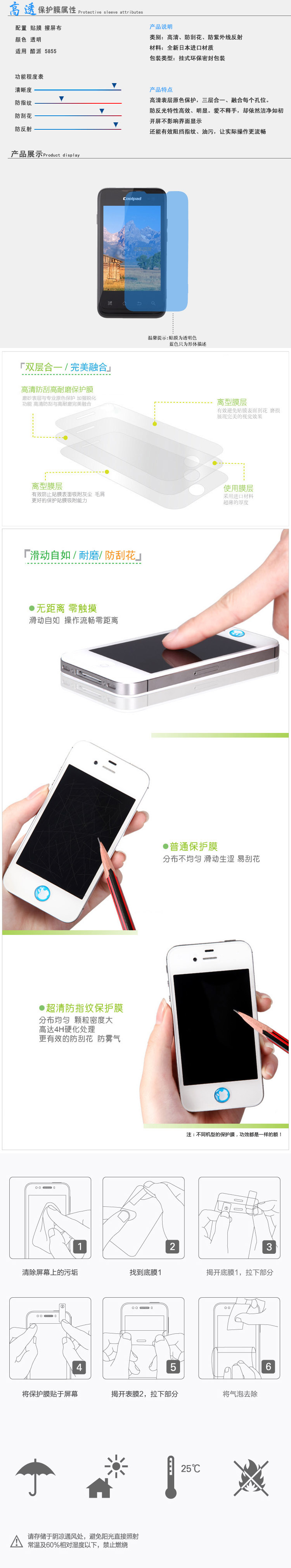 产品名称 : 酷派 5855高透耐刮花系列保护贴膜产品材料 :高度透光材质包装明细:保护膜1片,专用清洁无尘布1片 特 色 : 高度透光材质制造 屏幕显示进一步锐化 高透清晰 画面效果尤佳 专业原色保护 液晶面视觉效果清透舒适 色层丰富 产品更防刮 耐磨损 使用更流畅 不生硬晦涩 展现流韵之美 体验HR高透系列贴膜 畅享随心所欲1、进口特种材料,视觉近乎隐形效果2、屏幕显示效果清晰,色彩还原真实,不易产生气泡3、在保护昂贵屏幕免受划痕的同时,获得最佳的视觉使用体验。