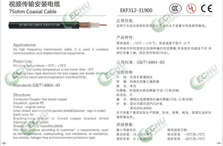 实芯SYV聚乙烯绝缘射频、视频电线电缆,产品说明: 导体使用单支实心或绞合裸铜或镀锡铜或铜包钢线实心或发泡PE绝缘可采用铝箔做屏蔽使用裸铜或镀锡铜线做单或双屏蔽,覆盖率达到95%以上。PVC 护套低损失,传播效率高,干扰可减少至最少参照 MIL-C-17F 标准型号 规格 导体根数 单根导体直径φ 近似密度KG/KM 外径mm 编数 编丝直径 编织材质 SYV 75--2--1 1 0.26 13.2 3.2±0.2 48 0.1 纯铜(BC) SYV 75--2--1 1 0.26 14.4 3.2±0.2 48 0.12 纯铜(BC) SYV 75--2--1 1 0.26 14.4 3.2±0.2 64 0.1 纯铜(BC)