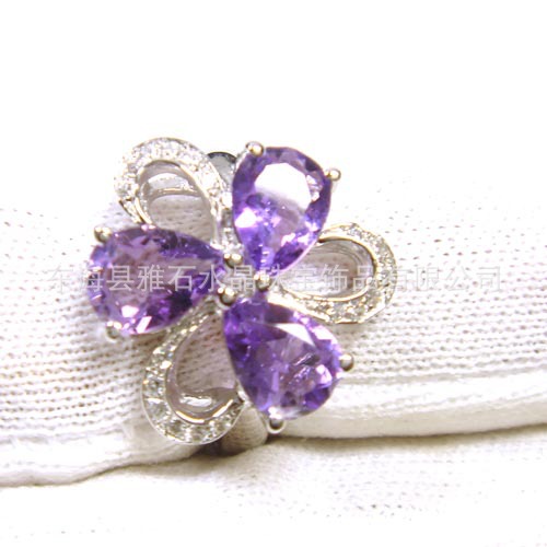 【名称】925银镀白金金天然紫晶三叶草戒指