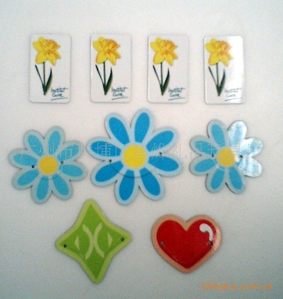 1)磁性冰箱贴:采用下面软胶磁铁+上面铜版纸彩色印刷腹膜制作而成。
