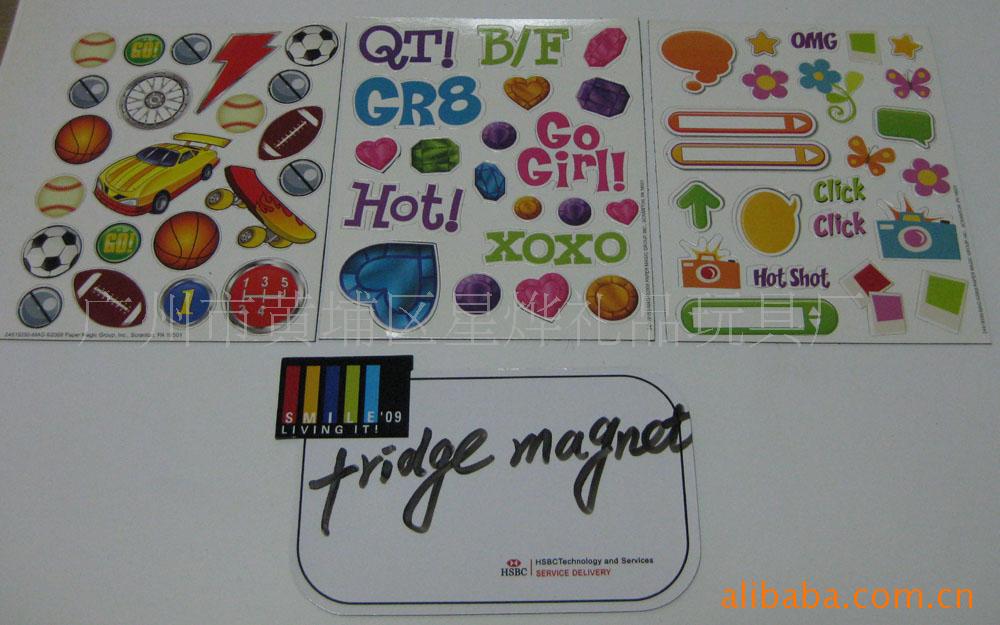 1)磁性冰箱贴:采用下面软胶磁铁+上面铜版纸彩色印刷腹膜制作而成。