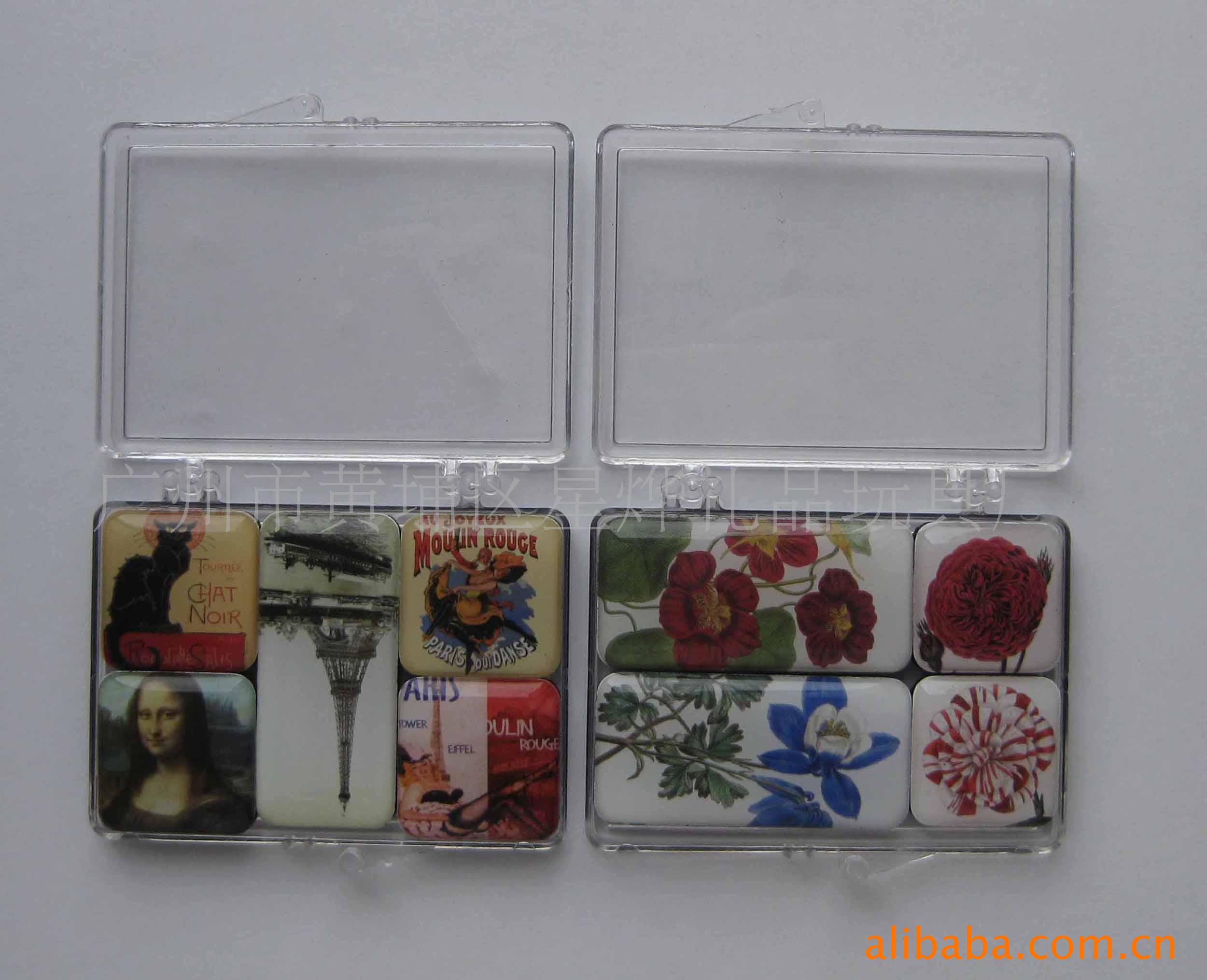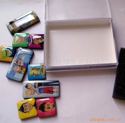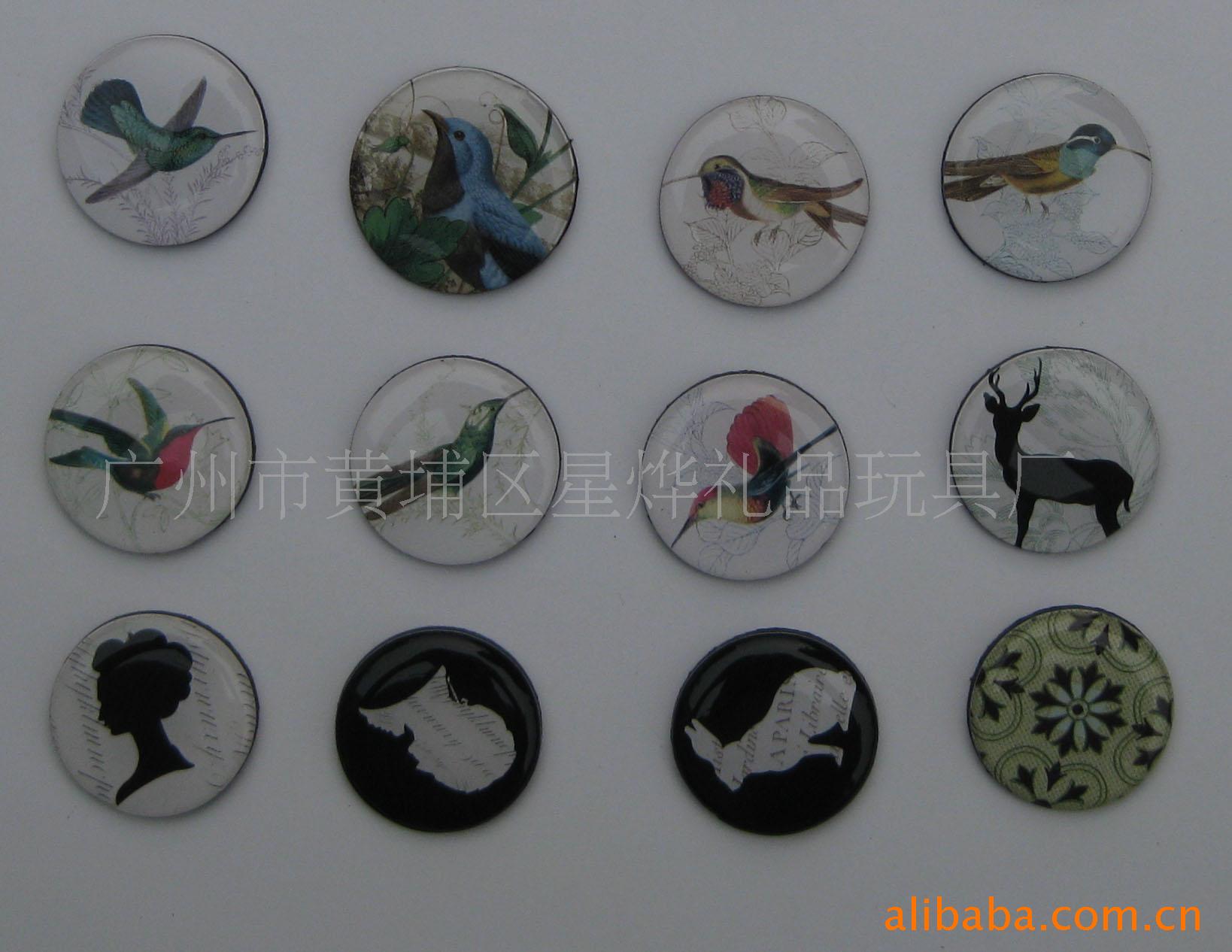 11)玻璃冰箱贴:采用下面软胶磁铁+上面铜版纸彩色印刷+半圆玻璃窗腹膜制作而成