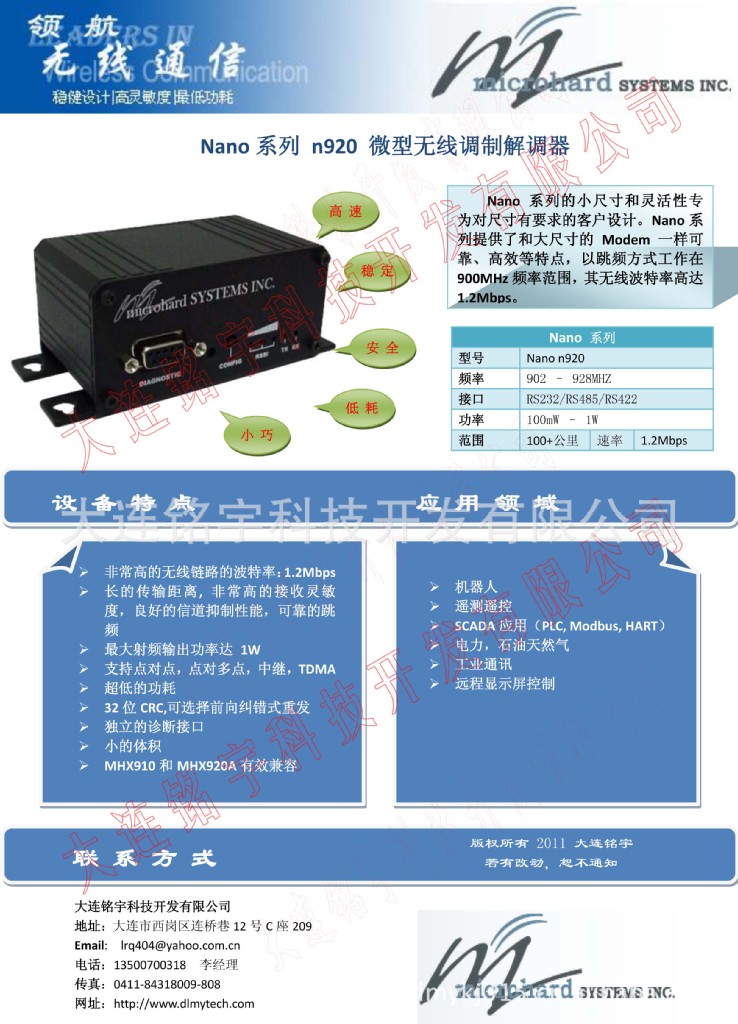 Nano系列的小尺寸和灵活性专为对尺寸有要求的客户设计。Nano系列提供了和大尺寸的Modem一样可靠、高效等特点,以跳频方式工作在900MHz频率范围,其无线波特率高达230kbps。