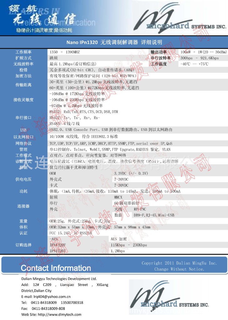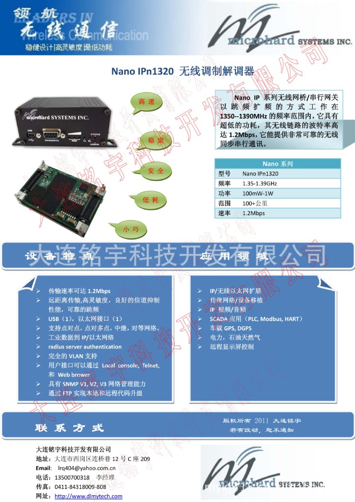 Nano IP 系列无线网桥/串行网关以跳频扩频的方式工作在1350--1390MHz的频率范围内,它具有超低的功耗,其无线链路的波特率高达1.2Mbps,它能提供非常可靠的无线同步串行通讯。
