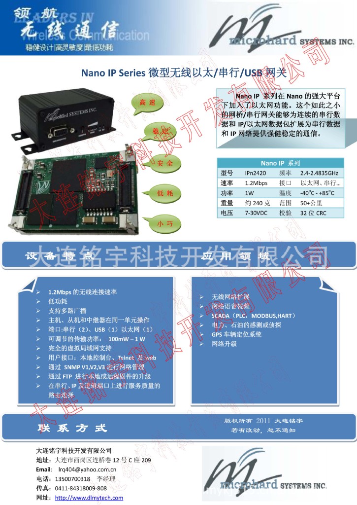 Nano IP 系列在Nano的强大平台下加入了以太网功能。这个如此之小的网桥/串行网关能够为连续的串行数据和IP/以太网数据包扩展为串行数据和IP网络提供强健稳定的通信。