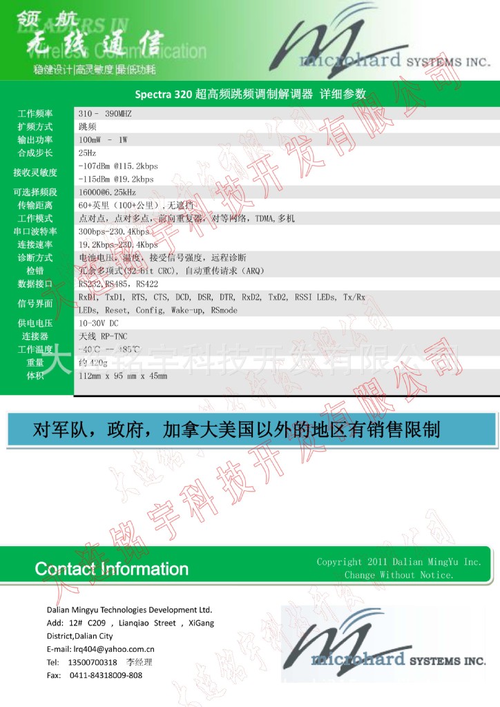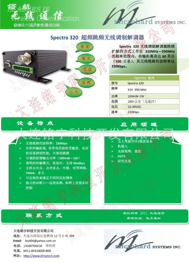 Spectra 320无线调制解调器跳频扩频的方式工作在310MHz—390MHz的频率范围内,传输距离高达60英里(100公里),其无线链路的波特率达230Kbps。