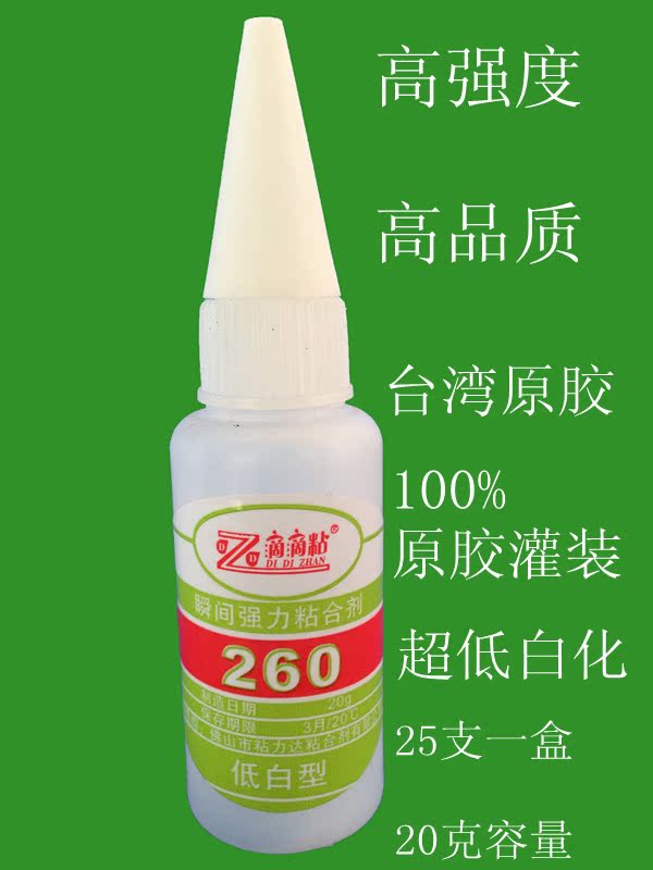 260胶水的特点 260强力胶水,无色透明流动性良好的液体,易挥发,遇水即聚合固化。本产品单组份、固化速度快、使用方便、粘接力强、粘接材料广泛,可用于钢铁、有色金属、橡胶、皮革、塑料、陶瓷、玻璃、木材等,但用于聚乙烯、聚丙烯、聚四氟乙烯制品,材料表面需经特殊处理。广泛用于电器、仪表、机械、电子、光仪、医疗、轻工民用等到行业。