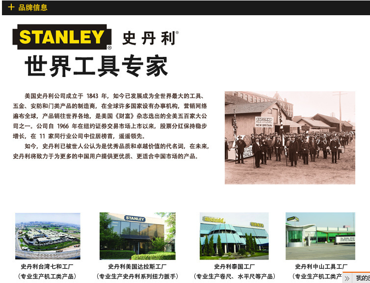 | | 悠久的历史:1843年,弗雷德里克和威廉.史丹利在美国康涅狄哥州新布赖顿开创了史丹利公司的前身,最早是一家* 造铰链,门闩和其它门窗五金 产品的小作坊。从成立伊始,史丹利就是一家热衷于创造的公司,设计、发明了众多直到今天仍然被广 泛使用的五金工具产品。特别 是世界第一把卷尺的诞生。大大改变了人们的工作方式,为加速人类工业化进程起到不可磨灭的作用。 |