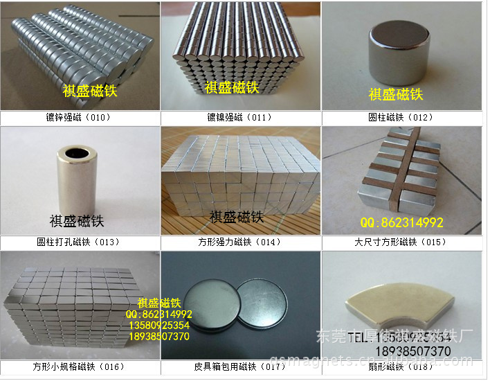 广东东莞祺盛磁性材料厂主导产品为强磁钕铁硼、橡胶磁、永磁铁氧体、磁力棒、磁力架、磁力块、大方块磁铁、小方块磁铁、小规格磁铁、大规格磁铁、小圆片磁铁、大圆片磁铁、磁棒、磁架、磁块、磁条、磁片、磁环、磁芯、磁钮、磁扣、磁吸、磁石、磁粒、磁钉、磁排、磁钢、铝镍钴、钐钴、磁性玩具、磁性礼品、磁性冰箱贴、磁性名片、磁性书签、磁性拼图、磁性相框、磁性胶片、磁性飞镖、磁性飞镖钯、磁性饰品、磁性制品以及五金配件铁片、铁壳等。产品主要用于电子、电工、电器、五金、机械、工具、皮具、箱包、手袋、保健、医疗、设备、水利、航天、航空、汽车、火车、玩具、礼品、工艺品、包装彩印等各个领域。我司的宗旨是:同样的产品比质量,同样的质量比价格,同样的价格比服务,同样的服务比速度。欢迎各界有需要用到我公司产品的厂家或个人随时与我司联系。