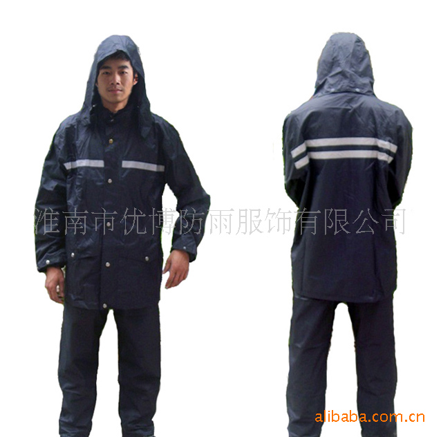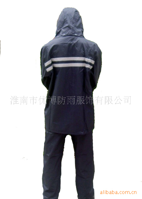 该款式为抗静电雨衣套装面料,加涂100%防水PVC涂层,高强度反光条,暗藏式帽子,上下身分体套装,防盗防水口袋,休闲款式!是理想的安全的野外作业防护雨衣。
