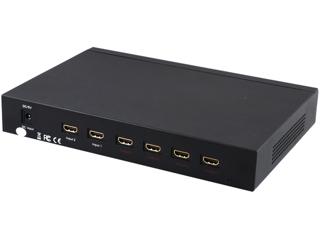这款HDMI矩阵能够轻松地将两个HDMI设备信号切换至四个HDMI端口,同时能够连接较长的HDMI线以再生HDMI信号。