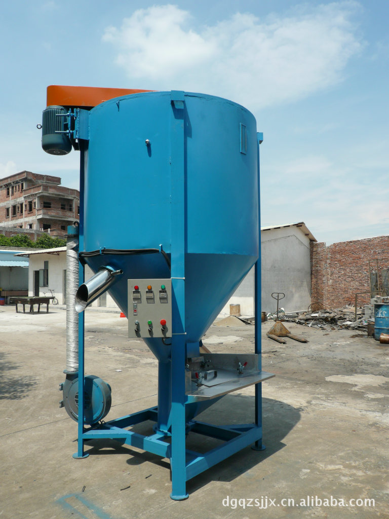 产品功能简介:主要通过电热风将物料表面及表层之水份烘干、排湿从而达到充分干燥的效果.本产品设计为两段快速上料,第一段将原料从料斗快速进入桶内,第二段再将原料快速螺旋至桶体上端,以伞状飞抛撒落,热风则从桶体下端的中心向四周吹出,从原料的间隙向上穿透,进行全面的热交换,动态干燥过程,由于桶内不停在翻滚加热干燥,从而达到了既快速混合又干燥的双重效果,如只需混合,那么只需关闭加热按钮即可,具有一机两用之功能.