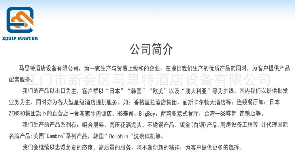 马思特酒店设备有限公司,是一家集生产、配套、贸易、工程与餐饮管理多结合的专业厨房设备厂家,我们的总部坐落于广东省江门市新会区,在香港以及上海均设有分公司。