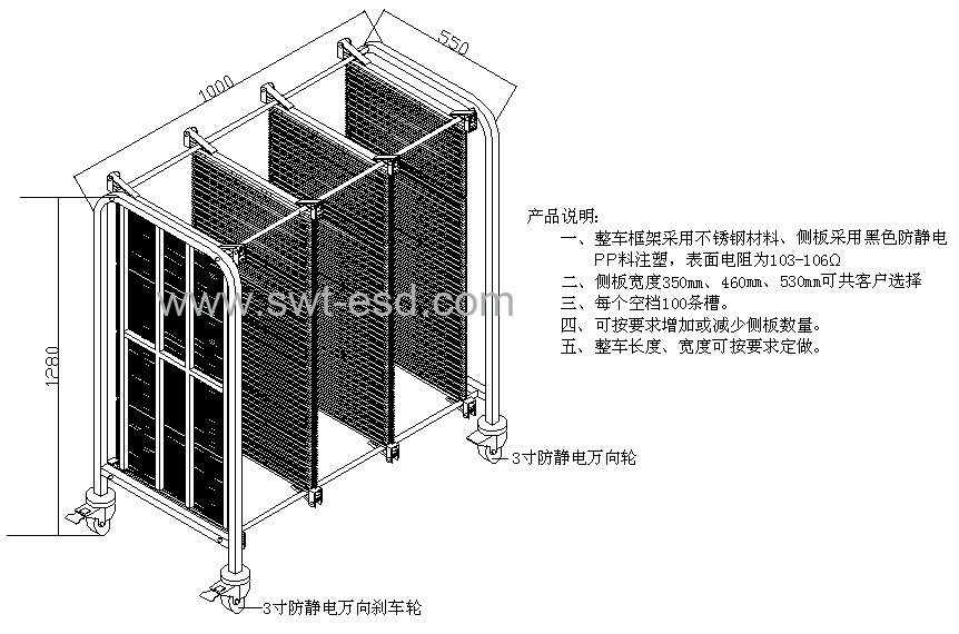 轮子:4"防静电轮(2个刹车万向、2个万向)
