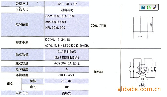 外型尺寸: 48*48*97工作方式: 通电延时延时范围:Sec:9.99,99.9,999 Min:99.9,999 Hr:99.9,999额定电压:DC:12, 24,48V AC:12, 24,48,110,220,380V 50/60HZ触点数量: 2组延时触点触点容量: AC250V 5A 阻性安装方式: 面板式