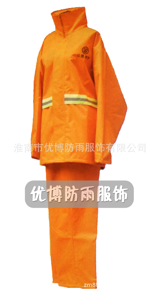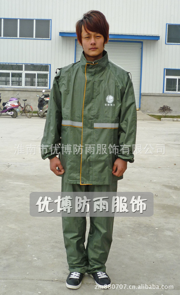 该款式为190T涤丝纺面料,加涂100%防水PVC涂层,高强度反光条,暗藏式帽子,上下身分体套装,防盗防水口袋,休闲款式!是理想的安全的野外作业防护雨衣。