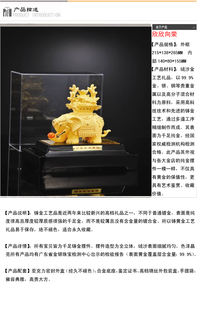 金莱福绒沙金千足金摆件 大象 结婚贺寿商务礼品 欣欣向荣小