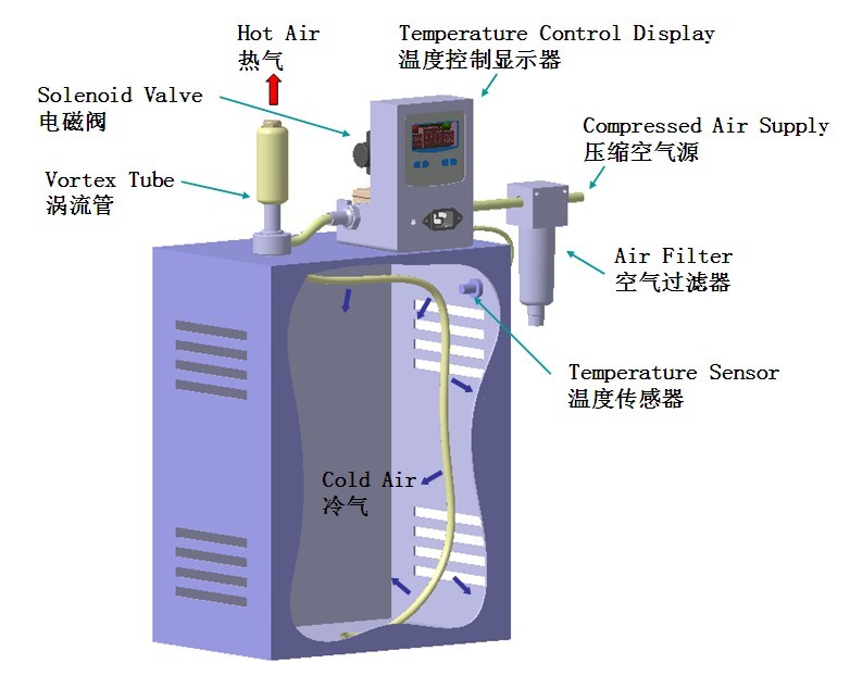 涡流管以压缩空气为动力源,压缩空气流经涡旋管后变成冷、热两股气流,一端是热气流,另外一端是冷气流。