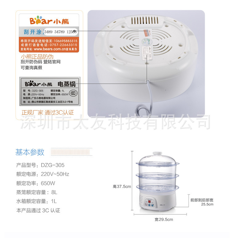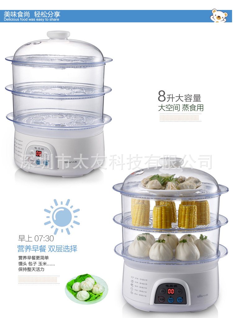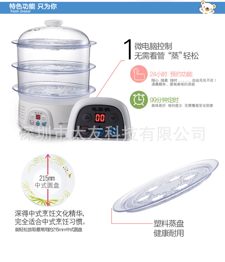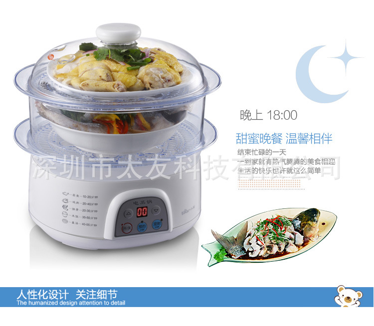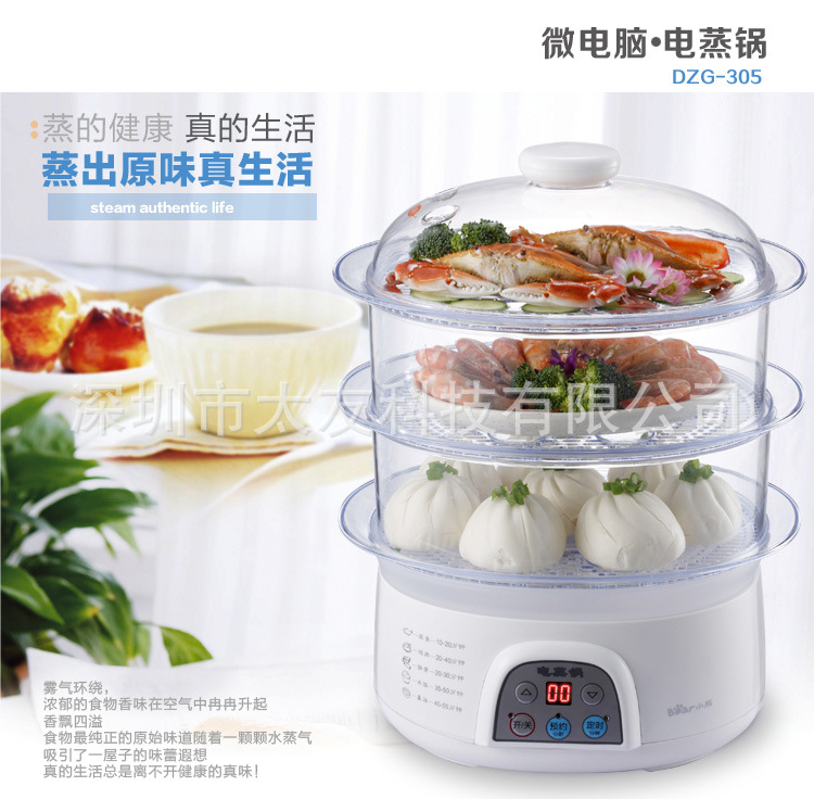 采用三层可分离式蒸笼和蒸盘,使用方便;健康“蒸”主义,“蒸”最大程度的保留了食物原有的蛋白质、维生素等营养成分;“蒸”保持了菜肴的原汁、原味,带出食物的新鲜美味;“蒸”为无油烹调,绝无油烦恼,更健康、厨房更易清洁。 电蒸锅DZG-305的主要特点: ◇外观美:时尚外观,精致工艺; ◇高效率:15秒快速出蒸汽; ◇防干烧:水干自动断电,安全可靠; ◇更精确:微电脑控制,保证最佳火候; ◇人性化:蒸笼与蒸盘采用分离式结构,使用清洗更方便; ◇大容量:3层蒸笼,8升大容量。