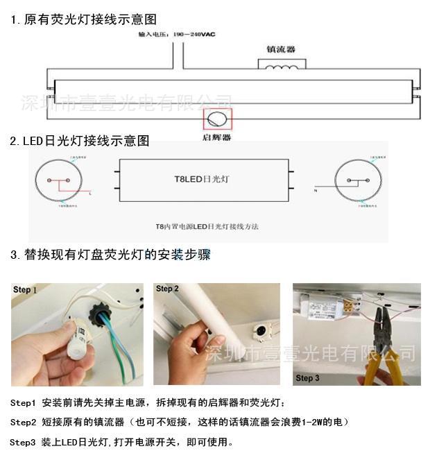 1、LED日光管与传统日光管支架完全配套,不需要另外制作支架。