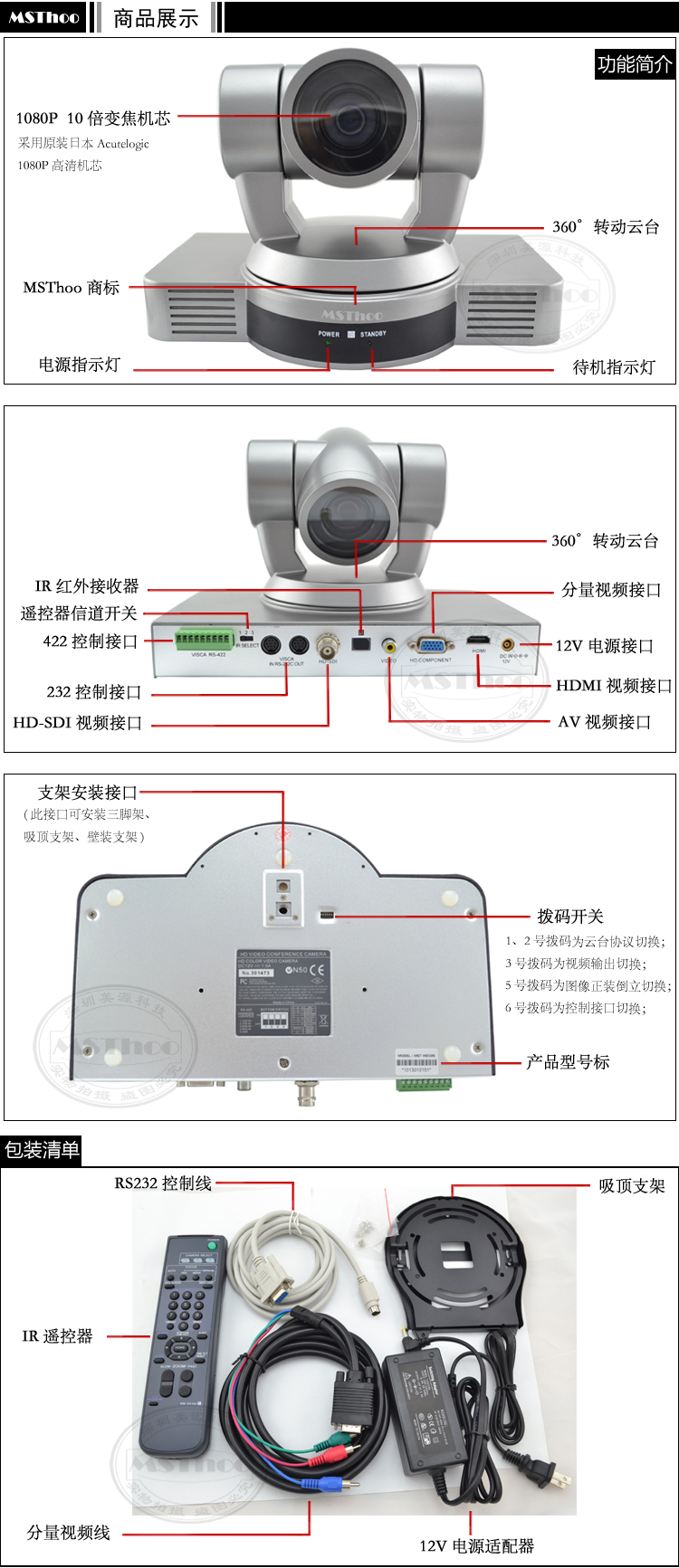 视频会议高速型摄像机MST-HD10产品是视频会议系统业界专用摄像机,采用日本原装全高清1080P机芯(原始图像,绝对没有压缩)。外形美观、造型别致、结构紧凑;运行平稳、无噪声;定位精确、停止时无偏差抖动,可靠性高;可长期稳定运行,使用方便,无须维护。具有多点目标预置、记忆、区域扫描、辅助开关控制、红外遥控等功能。360°水平无限制扫描范围,兼容多种控制协议,采用标准RS422/RS232控制方式。