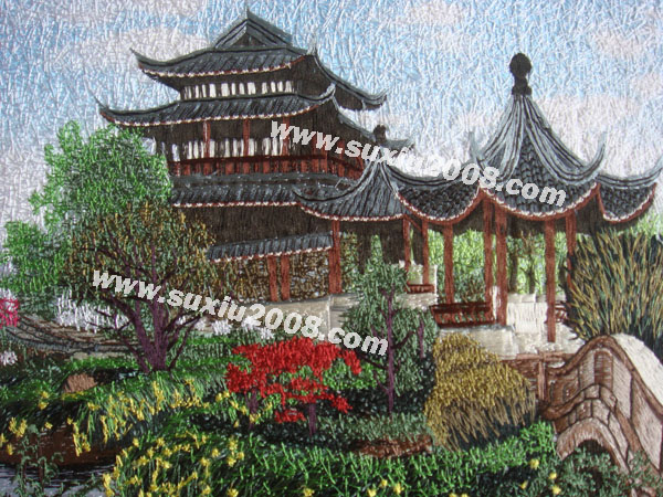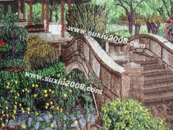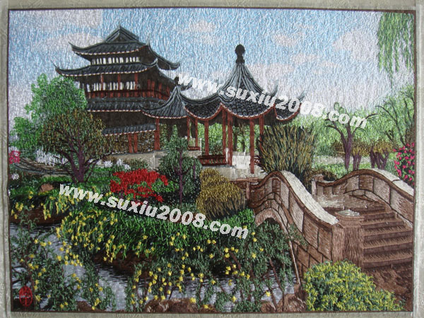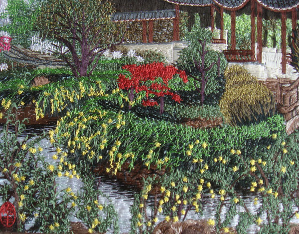 园林一角:绣工精细,色彩搭配细腻准确,为机绣中的精品 | | |