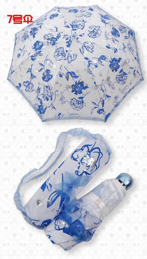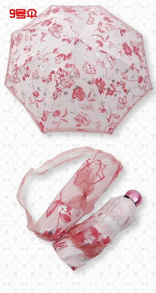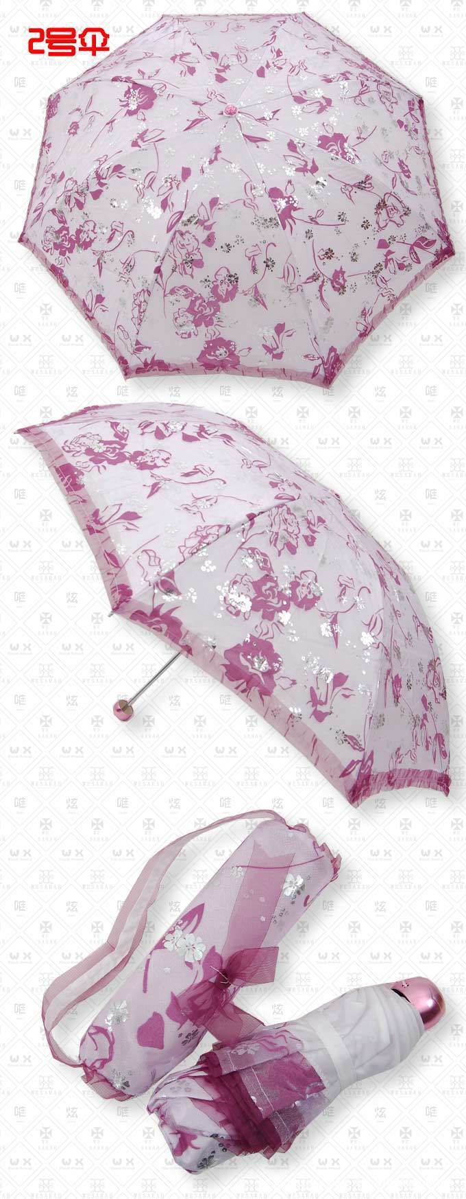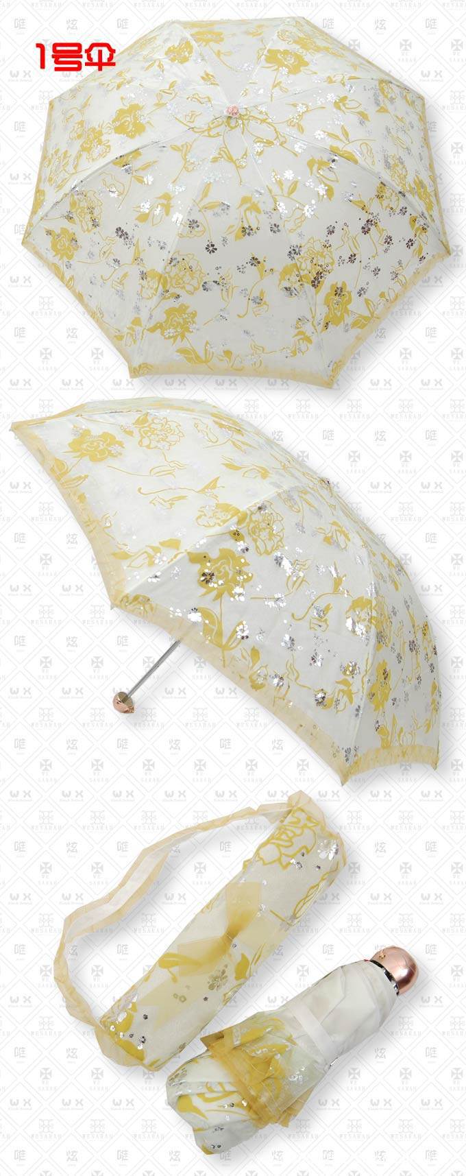 特点:双层伞面,超轻伞骨,里层为加强防紫外线纯白色高密碰击布,外层为植绒烫银纱,植绒部分手感毛绒绒的,烫银部分亮闪闪的,在阳光下会闪现出璀璨光芒,还有可爱的带着蝴蝶结的小拎包,很美哦!
