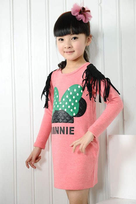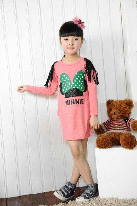童装批发 2013春装女童-韩版贴布卡通垫肩流苏长袖T恤201303QQT03