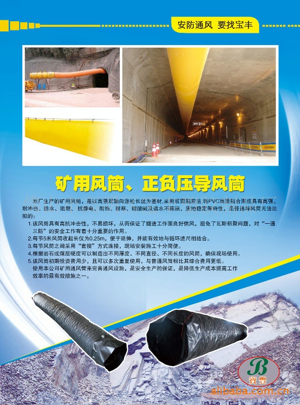 矿业及隧道通风客户要求耐久、强度及质量。宝丰公司的高强度织物生产线及专利产品矿用通风管在世界上已得到10多年的验证。结合我们更新产品设计以及在矿业和隧道通风方面的经验,宝丰公司生产的柔性通风管道产品显示优异的撕裂和抗张强度、耐高压能力、减小的压力损失以及低泄露结合部。我们的产品经权威机构测试证实具阻燃性、耐久及容易使用,并且容许从风机到通风面的长距离操作。