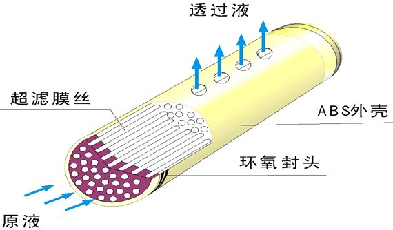 超滤设备是利用多孔材料的拦截能力,以物理截留的方式去除水中一定大小的杂质颗粒。在压力驱动下,溶液中水、有机低分子、无机离子等尺寸小的物质可通过纤维壁上的微孔到达膜的另一侧,溶液中菌体、胶体、颗粒物、有机大分子等大尺寸物质则不能透过纤维壁而被截留,从而达到筛分溶液中不同组分的目的。该过程为常温操作,无相态变化,不产生二次污染。