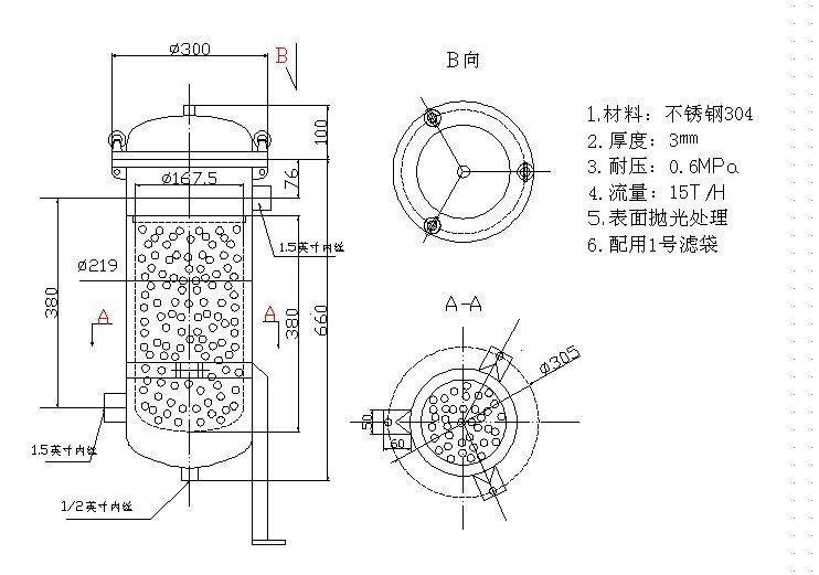 多袋式袋式过滤器采用侧进底出方式(也可采用底进底出方式),通过管道中的压力将过滤液体介质压入或抽入过滤器桶体,要过滤的液体介质经由电抛光冲孔支撑滤蓝承托的过滤袋的过滤,产生理想的固液分离达到液体介质被过滤的效果。