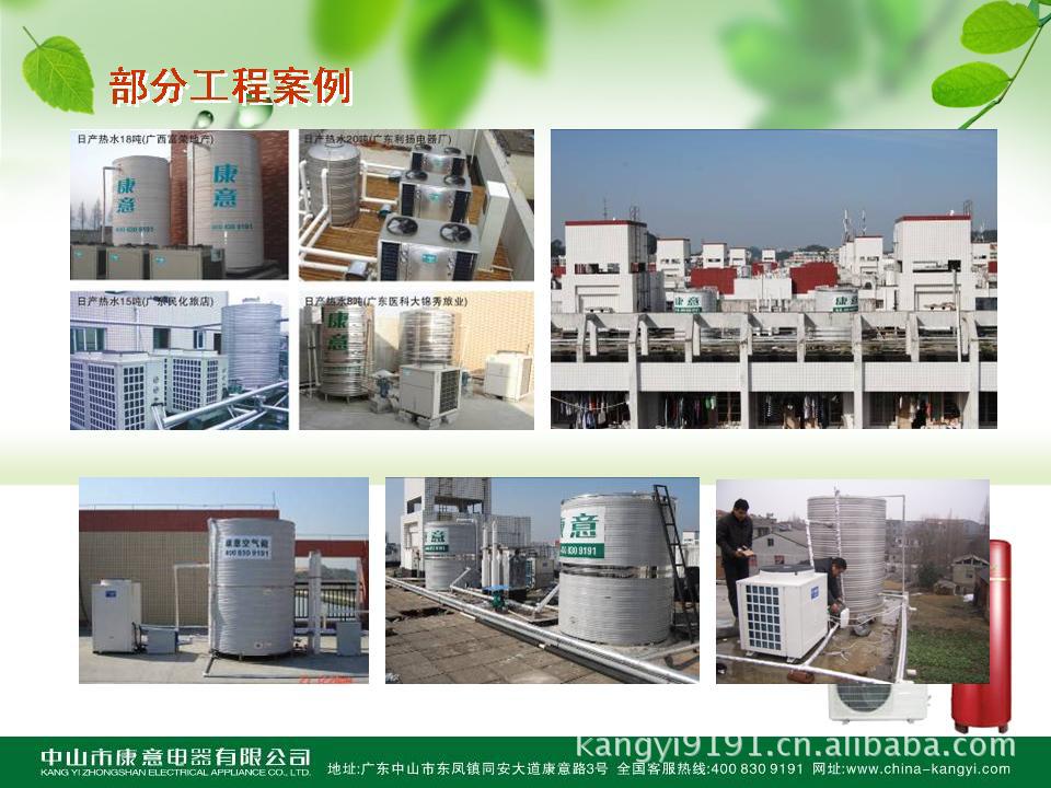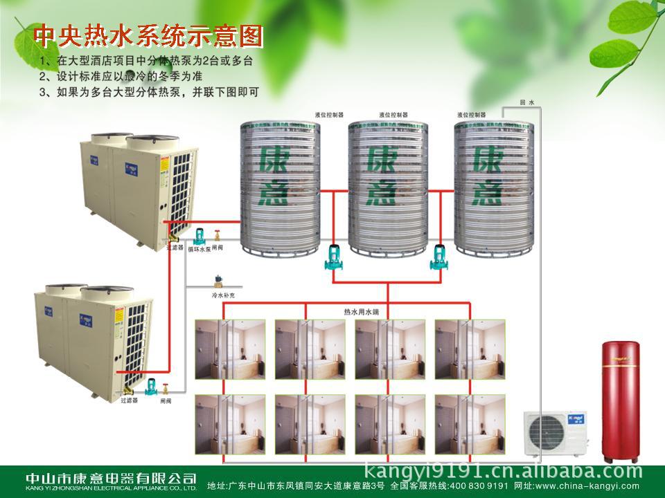 中国空气能行业十大品牌---康意空气能产品选用美国谷轮COPELAND公司独家专利产品压机,独有调节功能和柔性涡旋设计,可靠性和稳定性非常高;系统主要元件均采用欧美高品质尖端产品。厂家直销热水工程,特别适合星级宾馆、特别适用于别墅、美容美发、星级宾馆、桑拿浴池、足浴保健、水疗会所、职工宿舍、学校澡堂、学生宿舍、中小型宾旅馆、快捷酒店、中小型医院、健身会所、俱乐部、游泳池、地板采暖、福利院等生活生产热水供应。