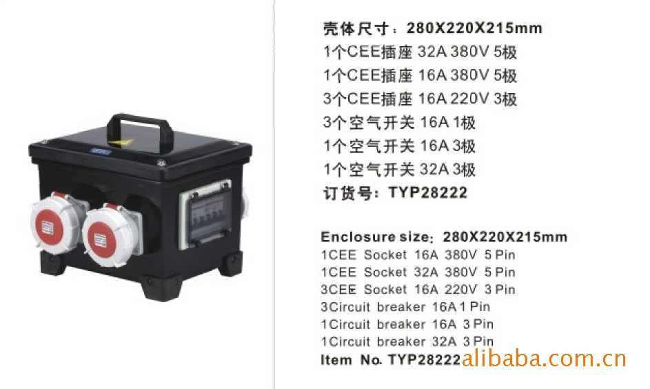 TYP系列IP55防水电箱,采用高分子树脂合成钢制成,具有较强的抗冲击能力及耐温度变化能力。产品为适合广大用户的需求,设计有便携式及挂墙式两种规格。产品具有阻燃,抗老化,高压防水溅等优点。适合环境恶劣的输配电源,展览馆、体育馆、工厂的输配电源,户外灯光及音响流动电源输配,舞台灯光及音响流动电源输配,港口码头及建筑工地流动电源输配等多方面领域使用。