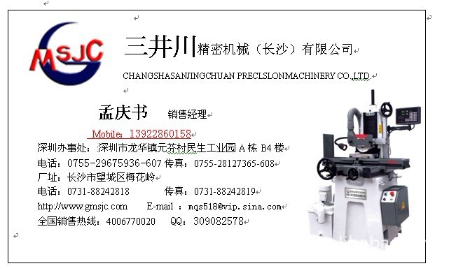 长沙三井川精密机械有限公司(原昆山三井川精密机械有限公司), 位于中部重工业之都,并有“楚汉名城”之称的湖南长沙。是一家的专业厂商。本公司是一家集设计、制造、销售为一体的专门研究和制造各种规格的平面磨床的专业厂商。