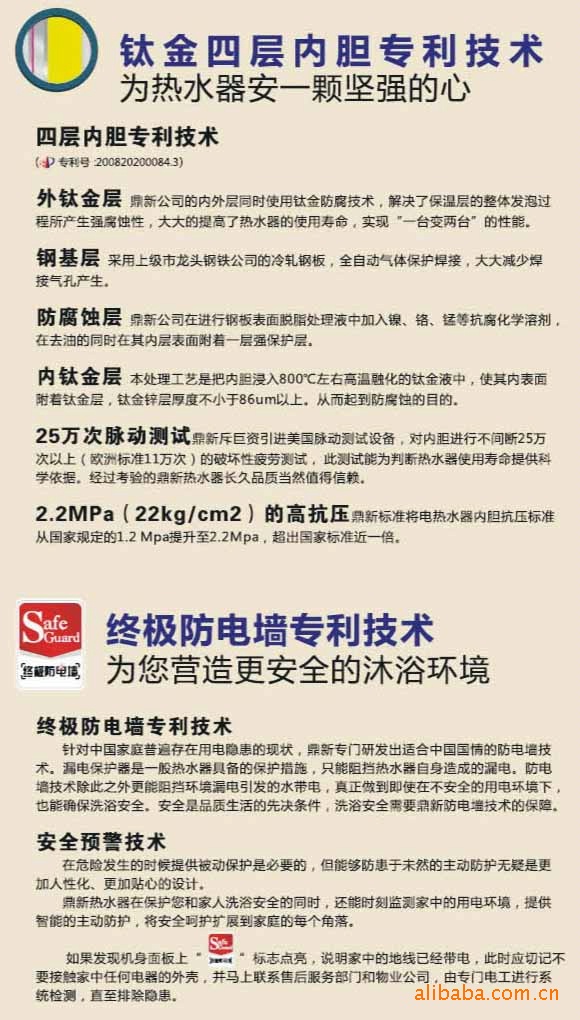 浙江鼎新电器是中国电热水器行业的创始企业之一,在该行业已有二十多年的专业制造经验,拥有“电热水器防电墙”安全技术的三大品牌企业之一。是一家集研发、生产、销售、服务于一体的现代化企业。鼎新系列产品均通过国家电工委员会安全认证,获得国家3C安全质量认证、 ISO9001认证和欧共体CE认证,并获得符合国家标准的“终极防电墙”专利技术认证和“四层内胆”专利技术认证,欢迎咨询洽谈。
