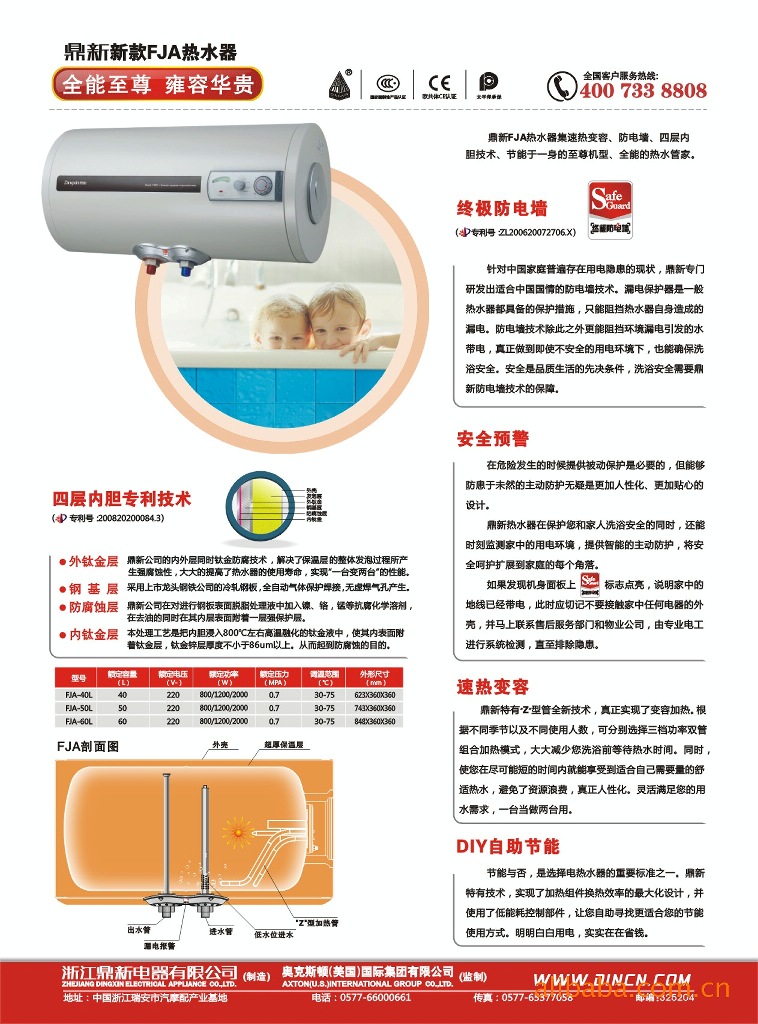 浙江鼎新电器是中国电热水器行业的创始企业之一,在该行业已有二十多年的专业制造经验,拥有“电热水器防电墙”安全技术的三大品牌企业之一。是一家集研发、生产、销售、服务于一体的现代化企业。鼎新系列产品均通过国家电工委员会安全认证,获得国家3C安全质量认证、 ISO9001认证和欧共体CE认证,欢迎咨询洽谈。