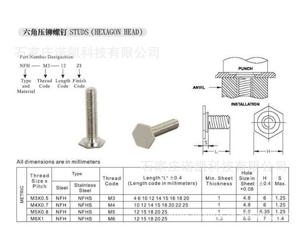 材质:不锈钢304型号分:小头不锈钢拉铆螺母、平头不锈钢拉铆螺母、沉头不锈钢拉铆螺母、外六角不锈钢拉铆螺母、盲端不锈钢拉铆螺母;还可以根据客户的来图定做!规格有M3 M4 M5M6 M8 M10 M12. 联系人,王卫华:13930468933 ,0311-80823275 网址:www.nuokaikeji.com QQ:724702139