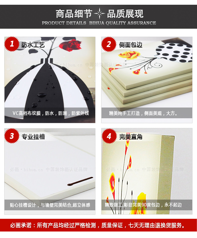 批发必看——新买家一定要看哦各位亲爱的买家,您好!您是次来深圳必画拿货吗?那请您花几分钟时间,耐心的看完以下的内容,了解批发规则,也节约了您与客服的沟通时间,用最少的时间,为客户创造最大的收益,是我们希望您看“批发必看”的主要原因。一、定货流程1、网上定货在阿里巴巴官网上直接下单的客户,请您下单前,与我们的客服联系,来确认您定的产品是否有货,您可以向销售人员索取最新定货单,在定货单上填写您所需商品的型号,数量,画芯编号,收货信息等。填写完毕后,保存后发回我们的销售人员即可,销售人员会跟您算好总金额,然后安排您付款。2、电话定货您登陆我们的阿里巴巴店铺、官方网站,联系我们的电话客服人员,订购电话:0755-33683030,13422119008,无需在网上填写资料。电话订购的时候,请务必说明订购的商品详细情况(包括:产品型号,数量,颜色、画芯编号,收货信息等),根据我们提供的付款方式,客户自行选择付款方式。,3、定做说明深圳必画面向全国市场,所以不能保证产品时时有货,请看好产品及时与销售人员及时联系,订做周期一般为5-7天。4、适用场合必画产品适用于广告促销、会议庆典、办公福利、商务公关、答谢客户、开业典礼、节日庆祝、婚庆、生日、乔迁、毕业升学、宗教用品、装饰品、纪念收藏品,家居装饰、酒店宾馆、KTV等各种高档娱乐场所必备装饰品。二、起批数量及价格说明1、有框画只有同款产品同规格情况下按箱订货,所有产品即可按出厂价发货,如订货数量小于1箱,价格高于出厂价15%,另加额外木架包装费,同款产品同规格最小起批量15幅。2、无框画首次最低起批金额1000元,补货最低订货金额500元,可混批。三、产品质量我们的商品都是实物拍摄,真实客观文字描述,不会夸大任何一点。(拍摄光线和显示器不同可能会存在色差),请在定货前看清楚产品描述介绍,慎重考虑后下单定货。四、价格是否可以再优惠网站或定货单上的单价已经是我们的最低出批发价格了,不再议价哦,但每个时期我们都会推出不同的优惠活动哦。五、是否能发样品我们可提供给18*18的样品给您,请在客服引导下拍下样品。二次订货的时候退还样品费,如果满意了再进行更大量的合作。六、付款方式1、支付宝担保交易支持支付宝担保交易,买家收到货品无误,请即时确认付款,以便我们更好的为您服务,如买家2次以上收到货品无异议却不及时确认付款者,则本公司拒绝再次为该买家提供支付宝担保交易!批发量大,资金周转,请理解支持。2、银行汇款我们有多家银行的账号,如需银行汇款,请向我们的在线客服或电话客服索取银行账户。七、物流运输及费用装饰画属于易碎、重量物品,为降低客户的运输成本,所有订货产品发货均选择普通物流公司,直达城市2-3填可到达,地级市、县级城市中转5-7天到达,物流费用客户提货时,物流公司收取,如客户有合作指定物流,下单时请告知销售人员。八、售后服务产品质量问题公司承诺包退换,并承担来回运费,运输途中产品造成的破损,客户收到货物3天内,需提供实物照片,公司承担损耗30%。
