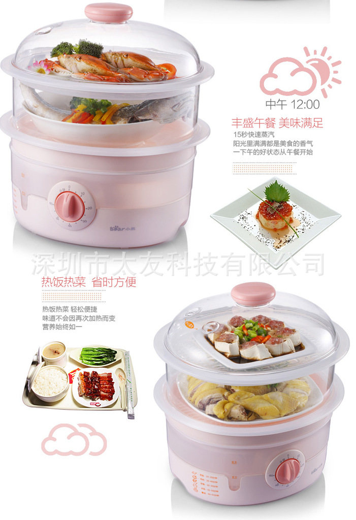 4蒸便捷 不用系上围裙,不再被油呛烟熏,只要将准备好的创意搭配食材放入小熊电蒸锅,选择相应的档位,无需看管,就坐享其成吧!