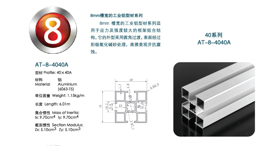 上海安腾铝业有限公司是国内生产工业铝型材的重点厂家之一,公司引进德国先进技术力量,产品已通过国际质量体系认证和产品认证的企业,是一家集研究设计开发制造销售服务为一体的科技创新新型企业。安腾铝业分为六大板块:1模具设计开发2铝型材挤压生产3工业框架及流水线 输送线设备开发安装 4铝制品深加工5熔铸氧化电泳静电 粉末 喷涂 6非标工业铝型材产品。