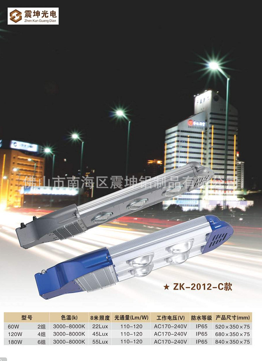 1;公司位于中国铝都佛山大沥镇。优质铝型材全新外观设计的路灯头外壳.外观新颖.简约.时尚.表面采用硬质阳极氧化.静电喷涂.散热与灯体一体化。