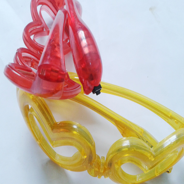 生日蛋糕发光LED眼镜: 这是一款非常流行的发光眼镜,由10个相同颜色的LED灯组成,并且有不同的闪光模式.当使用者在白天配戴时,其与一般眼镜一样实用;当使用者在夜间配戴时,将开关打开,可使宽架里的LED灯发光,能吸引很多人对你的关注, 这时其比一般光学眼镜更美观,同时也可以起到近距离照明的作用.