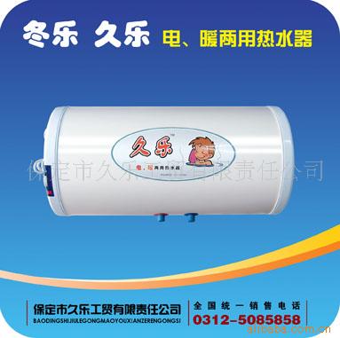 久乐电暖两用热水器为双热源,冬天用暖气加热,冬天不用电的电热水器,冬天运行无费用,节省费用300-500元以上,自动上水;非供暖期用电热源。投放市场后用户反映良好。方便安全、洁净环保 节能省钱。产品在我国北方市场很有推广价值。 该热水器配置漏电保护、安全阀、温控装置。热水交换率高,较一般1500瓦的电热水器快一倍多,可供家庭多人连续洗澡使用,不出冷水(一般电热水器无法相比)。该电暖两用热水器热水温度与暖气温度持平。