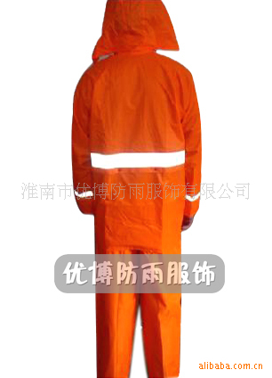 本品为防雨面料加PVC防水涂层,高强度反光条,双层防沾身透气网格设计,暗藏式帽子,上下分身套装,防水式口袋,款式休闲。可印字,100%抗透水,所有压延永久不脱落,可机洗,水温50度不退色,适用于环卫,园林,道路养护等。
