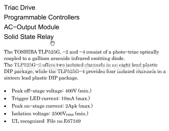 | 部件型号 | TLP525G | | | 封装:外形形状 | DIP4 | | | 管脚数 | 4 | | | 表面安装型 | Y or N | | | 表面贴装区分注意事项 | 提供表面安装等引线的器件 | | | LED触发电流 IFT, max | 10 mA | | | 导通状态电压峰值 VTM(最大) | 3 V | iTM=100 mA | | 关断状态电压峰值 VDRM(最大) | 400 V | | | 绝缘耐压 BVS@1minute (最小) | 2500 Vrms | | | 安全标准 UL | 已认证 | | | 安全标准 TÜV | - | | | 安全标准 VDE | - | | | 安全标准 BSI | - | | | 安全标准 IEC | - | | | 安全标准的补充说明 | - | | | 产品分类 | 光耦(光可控硅输出器件) | | | RoHS Compatible Product(s) (#) | Available |