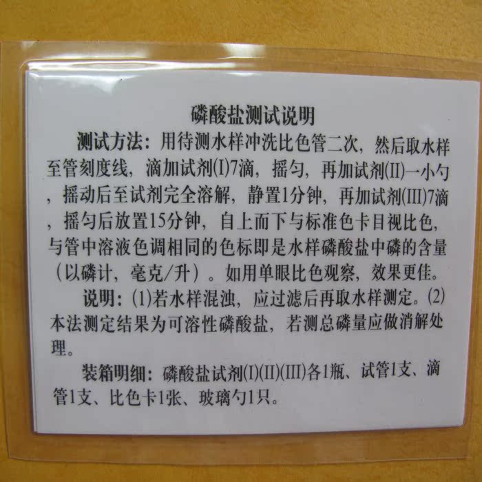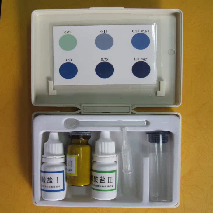 用待测水样冲洗比色管二次,然后取水样至管刻度线,滴加试剂(Ⅰ)7滴,摇匀,再加试剂(Ⅱ) 一小勺,摇动后至试剂完全溶解,静置1分钟,再加试剂(Ⅲ)7滴,摇匀后放置15分钟,自上而下与标准色卡目视比色,与管中溶液色调相同的色标即是水样磷酸盐中磷的含量(以磷计,毫克/升)。如用单眼比色观察,效果更佳。