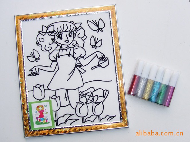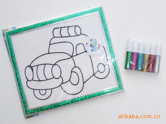 30*40规格KT板,用闪光胶水笔将自己喜爱的颜色涂覆在上面,自然干燥后就成为一副闪闪发光可爱的作品了.
