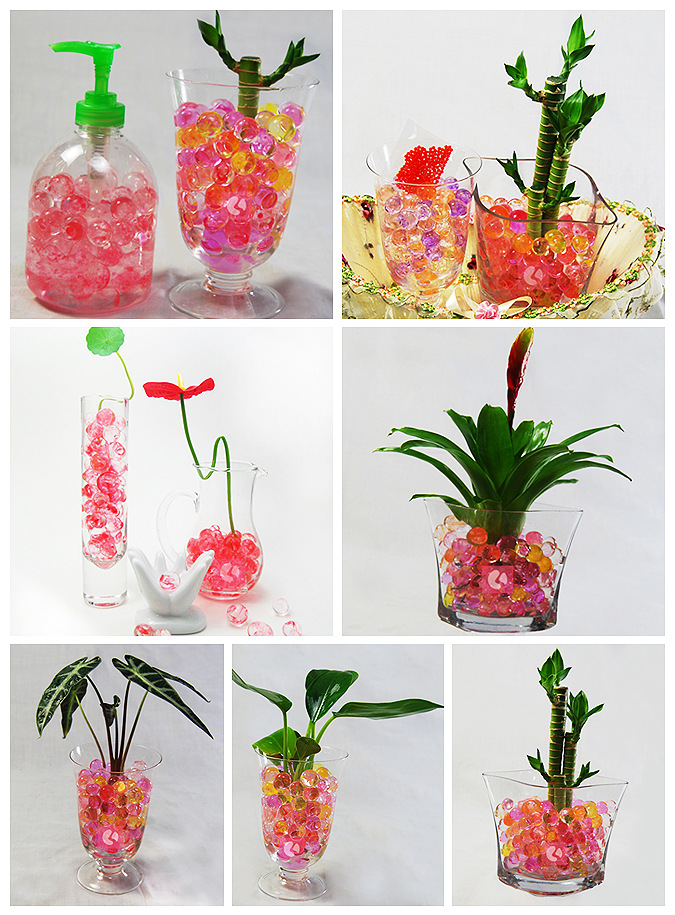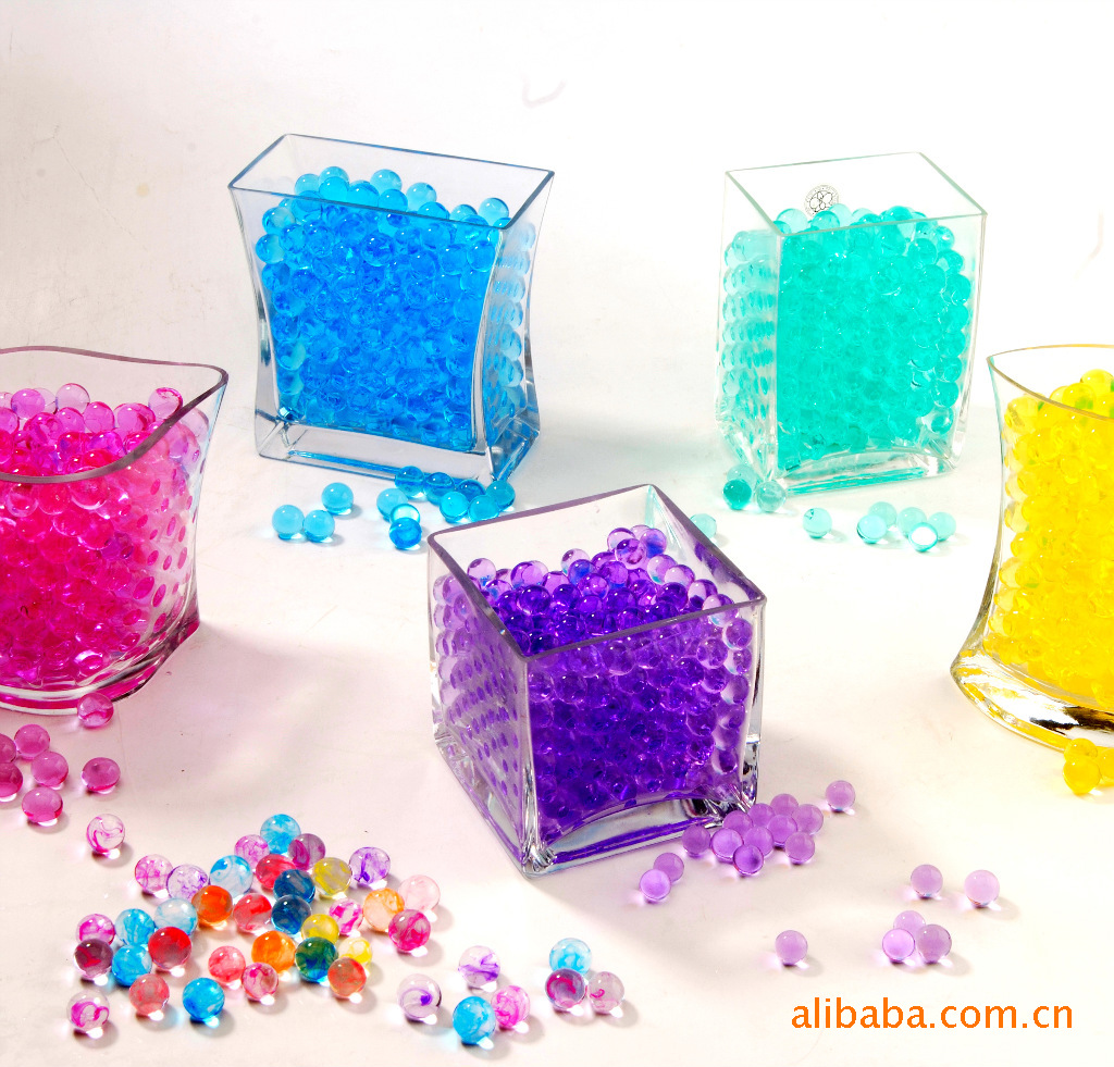 水晶珠其吸水后晶莹剔透,造型极佳,广泛应用于:鱼缸装饰,烛台装饰,制成各种工艺品、饰品。